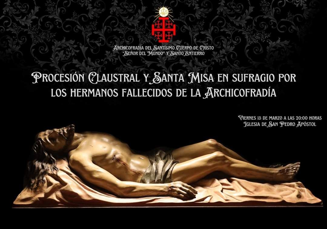 25/10/2023. El sábado 4 de noviembre, la Junta de Hermandades y Cofradías Pasionarias de nuestra ciudad celebra la tradicional Santa Misa en sufragio por los nazarenos y cofrades fallecidos. En esta ocasión estará presidida por la imagen de Cristo Yacente, perteneciente a la Archicofradía del Santo Entierro. A las 19,30 horas en la iglesia De San Pedro Apóstol.