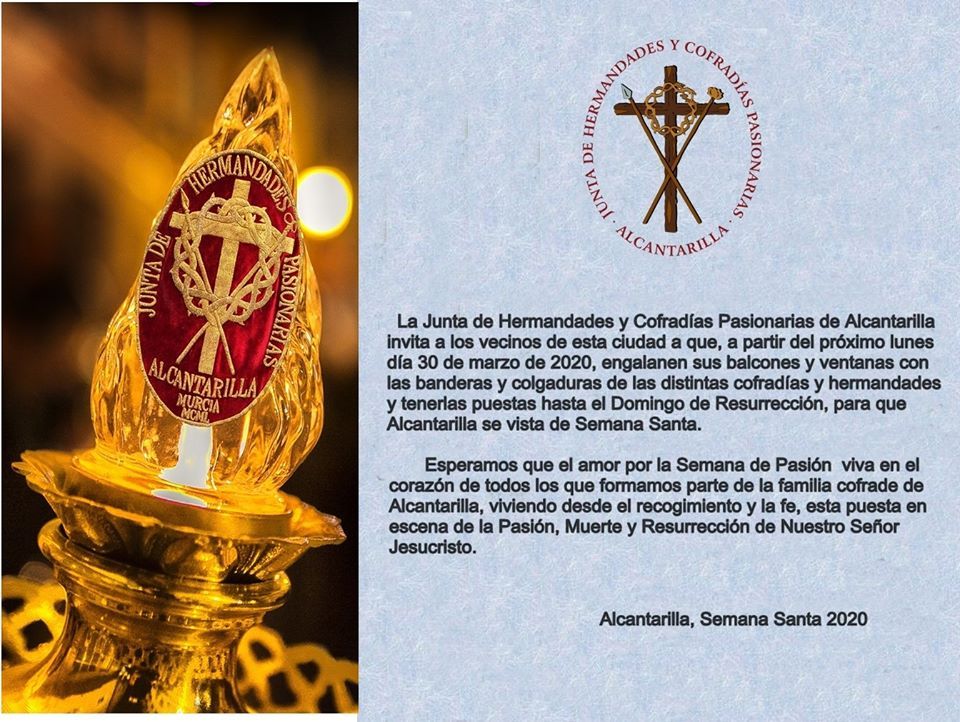 Mañana empieza la Semana Santa en nuestra ciudad y el Ilmo. Ayuntamiento de Alcantarilla quiere colaborar con la Junta de Hermandades y Cofradías Pasionarias en la retransmisión de todos los desfiles procesionales del pasado año. En la página de facebook del ayuntamiento.